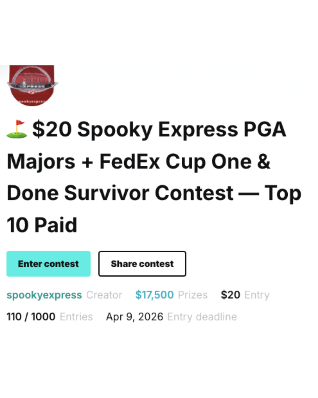 Spooky Express PGA One-and-Done – A $50 entry contest offering $10,035 in guaranteed prizes, ideal for players looking for a season-long One & Done at a lower entry point. Top prize payouts include $2,007 for first, $1,505.25 for second, and $1,204.20 for third. Standard golf One & Done rules apply: one golfer per tournament, no repeats, Dollar Winnings scoring, and up to 6 entries per player.