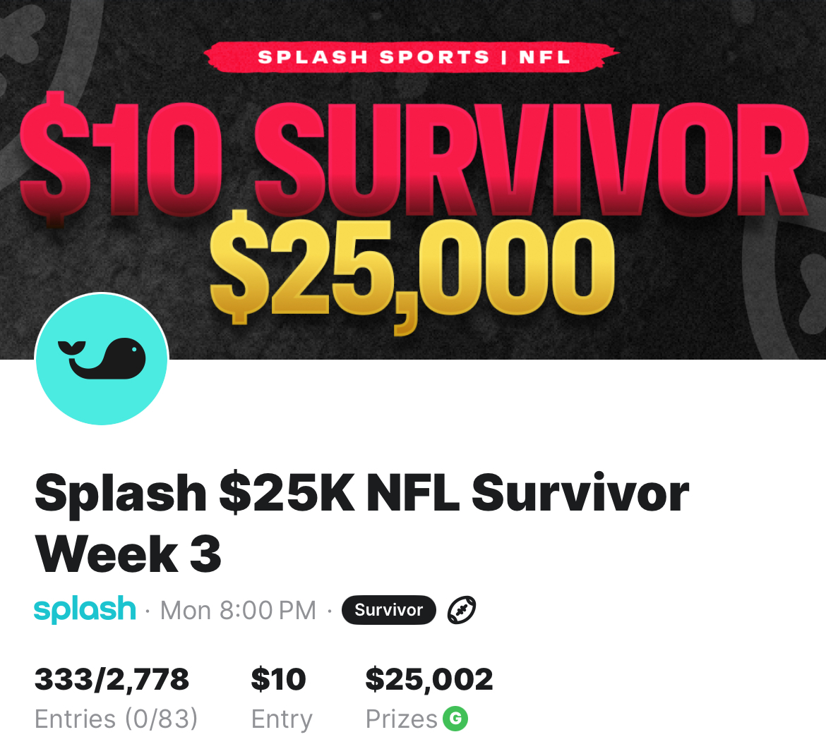 Splash $25K NFL Survivor — $10 entry, $25,000 in contest prizes, 2,778 entry max. A more accessible entry point that still offers meaningful payouts. This contest is perfect for building multiple entries, experimenting with different survivor strategies, or rallying your friends into a shared contest run.
