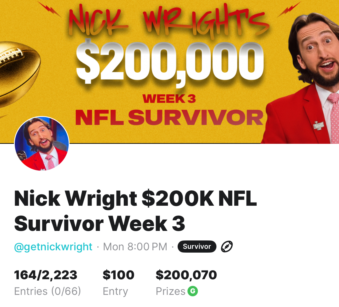 Nick Wright $200K NFL Survivor — $100 entry, $200,000 in contest prizes, 2,223 entry max. Backed by Fox Sports’ Nick Wright, this high-profile contest brings prestige along with serious upside. With a larger guaranteed prize pool, it’s designed for players who want to put their NFL knowledge to the test against some of the sharpest competition.