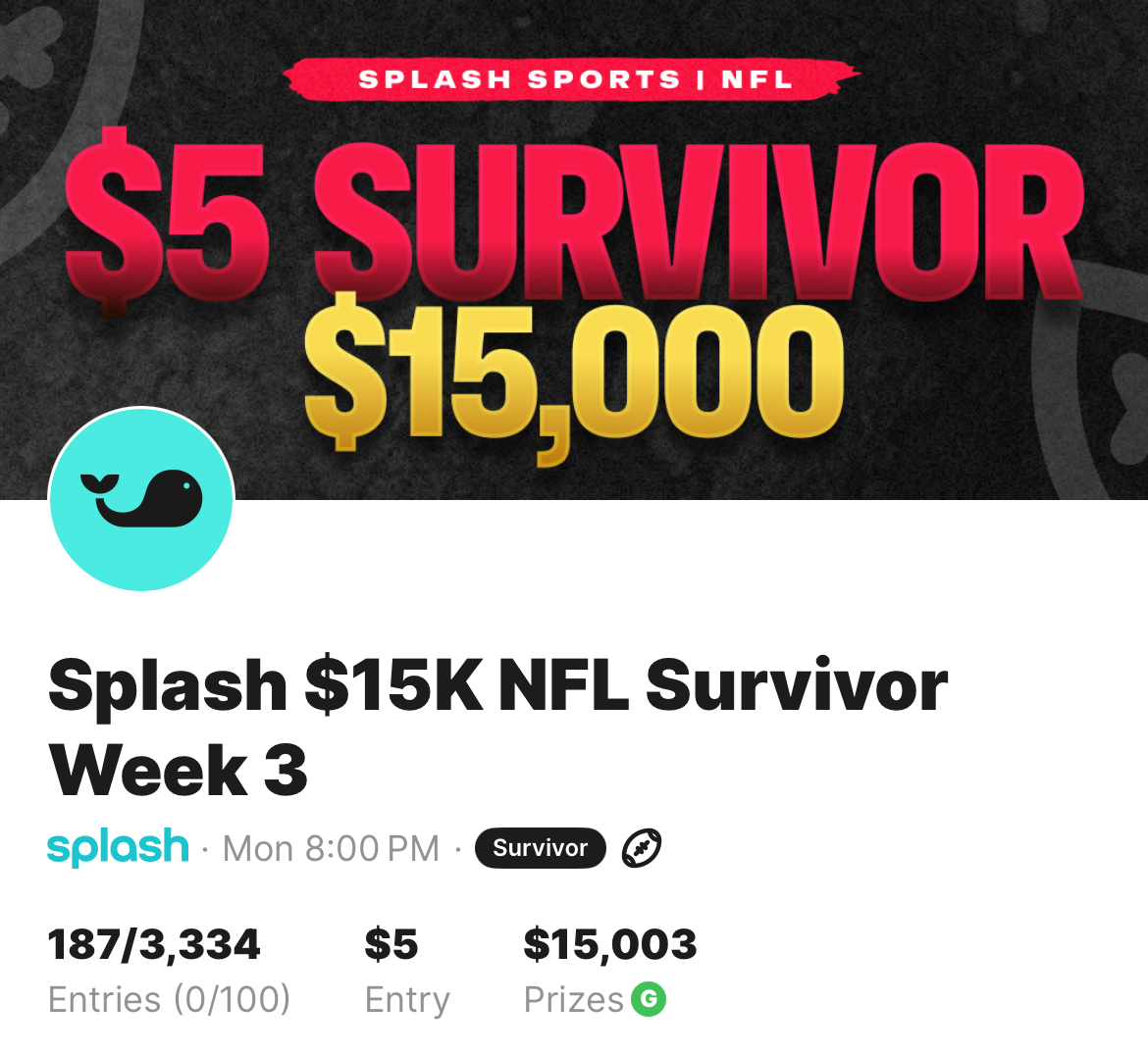 Splash $15K NFL Survivor — $5 entry, $15,000 in contest prizes, 3,334 entry max. An ideal low-cost entry point for Survivor players looking to get multiple tickets into play.