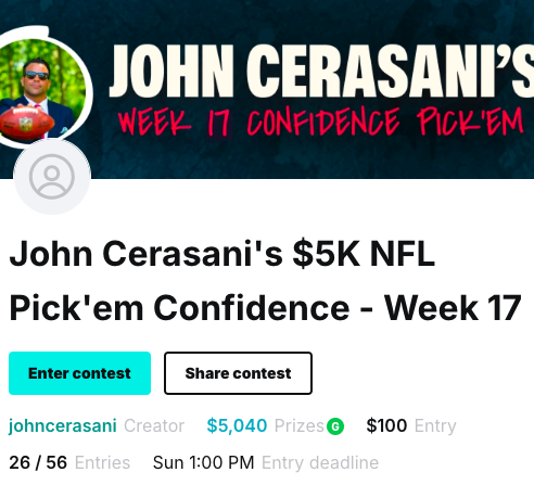 John Cerasani's $5K NFL Pick'em Confidence – A $100 entry contest featuring $5,040 in guaranteed prizes. Entrants make ATS selections for all 16 games on the slate and can lock in one “Best Pick” for double points. The top three finishers earn $2,772, $1,008, and $630 respectively. 3 entries are allowed, for players ready for high-stakes competition.