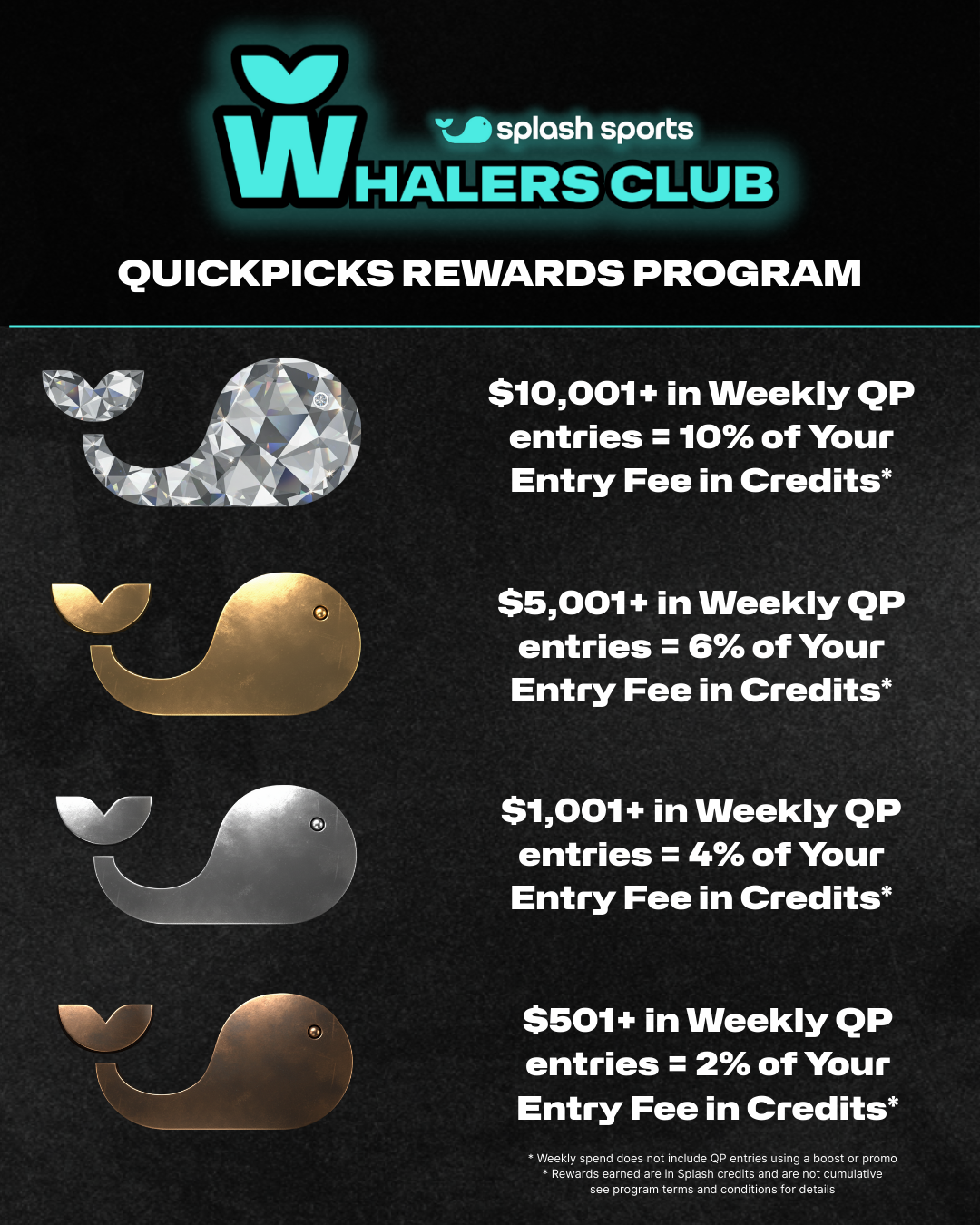 Join the Splash Whalers Club, the exclusive QuickPicks rewards program from Splash Sports. Earn weekly Splash Credits based on your play volume—up to 10% back every Friday.