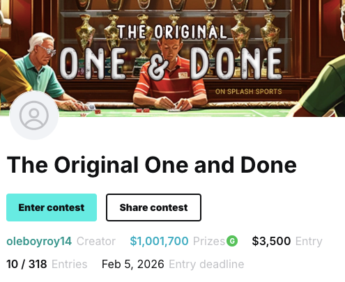 The Original One & Done – A $3,500 entry contest featuring $1,001,700 in guaranteed prizes, highlighted by a massive $207,567.73 first-place payout, $155,675.72 for second, and $103,783.81 for third. Players select one golfer for each tournament throughout the season, earning points based on Dollar Winnings, with no golfer allowed to be used more than once. The contest spans six segments and allows up to 5 entries per player, giving participants multiple paths to compete for one of the largest One & Done prize available.