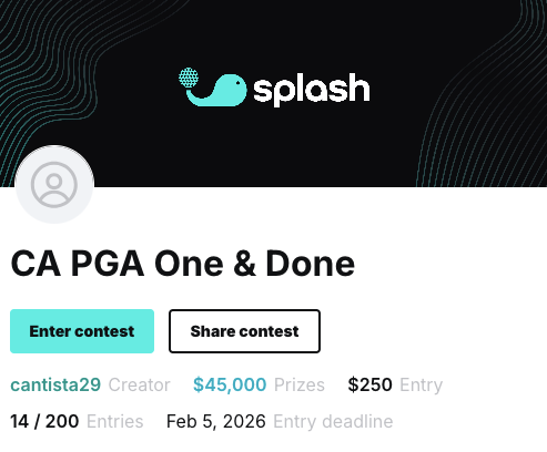CA PGA One & Done – A $250 entry contest featuring $45,000 in total prizes, highlighted by a $12,600 first-place payout, $3,600 for second, and $1,800 for third. Players select one golfer for each tournament throughout the season, earning points based on Dollar Winnings, with no golfer allowed to be used more than once. The contest includes both overall and segment payouts, allows up to 2 entries per player, and features automatic picks enabled with one autopick available for the season.