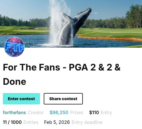 For The Fans – PGA 2 & 2 & Done – A $110 entry contest offering $96,250 in total prizes, built for players who want a twist on the traditional One & Done format. Top payouts include $28,875 for first, $19,250 for second, and $14,437.50 for third. Participants select two golfers per tournament and may use each golfer twice throughout the season, with scoring based on Dollar Winnings and special scoring applied to the Tour Championship. The contest allows up to 25 entries per player.